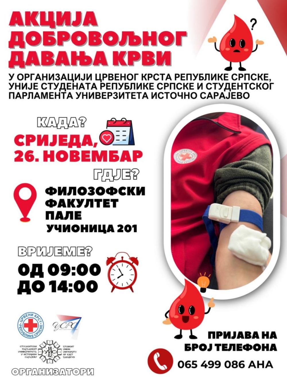 Crveni krst Republike Srpske, u saradnji sa Unijom studenata Srpske i Studentskim parlamentom Univerziteta u Istočnom Sarajevu, organizuje akciju dobrovoljnog darivanja krvi.