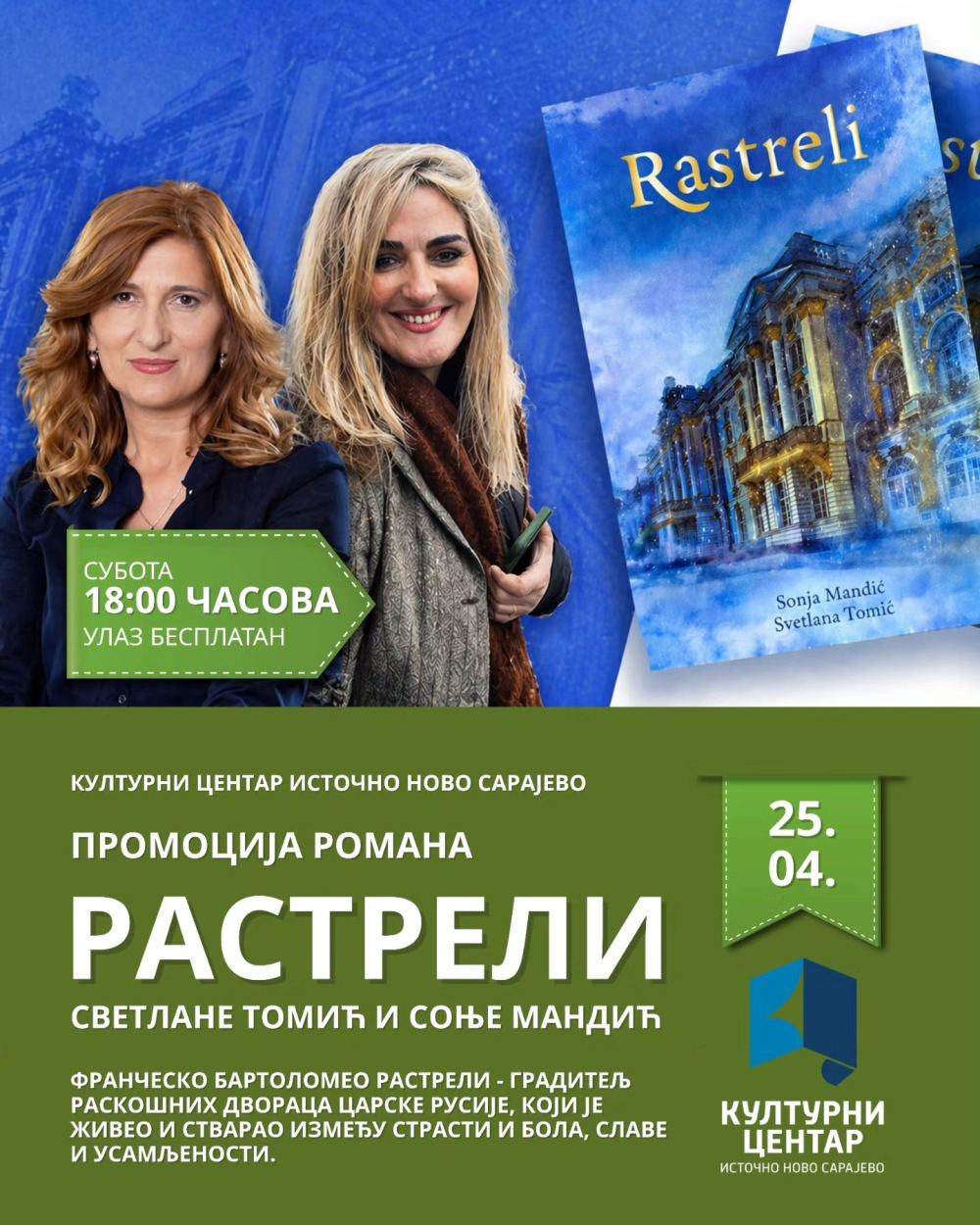Promocija romana „Rasteli“ autorki Svetlane Tomić i Sonje Mandić biće održana u subotu, 25. aprila, u Kulturnom centru Istočno Novo Sarajevo.