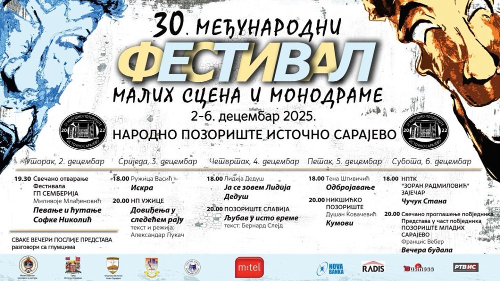 U Istočnom Sarajevu večeras počinje Međunarodni festival malih scena i monodrame Republike Srpske, trideseti po redu, a predstave će se održavati u Kulturnom centru Istočno Novo Sarajevo i Narodnom pozorištu Istočno Sarajevu.