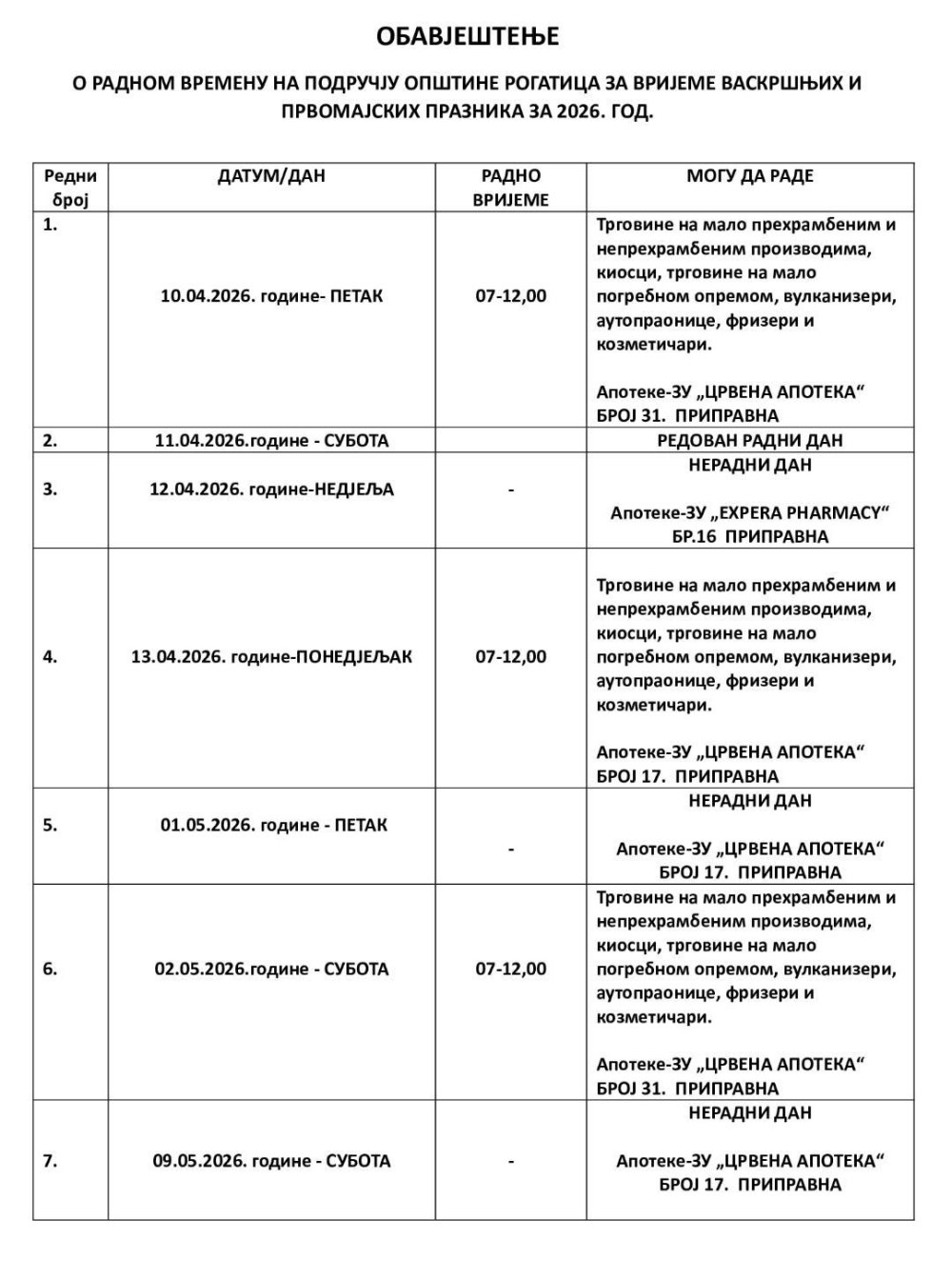 Obavještenje o radnom vremenu na području opštine Rogatica za vrijeme vaskršnjih i prvomajskih praznika.
