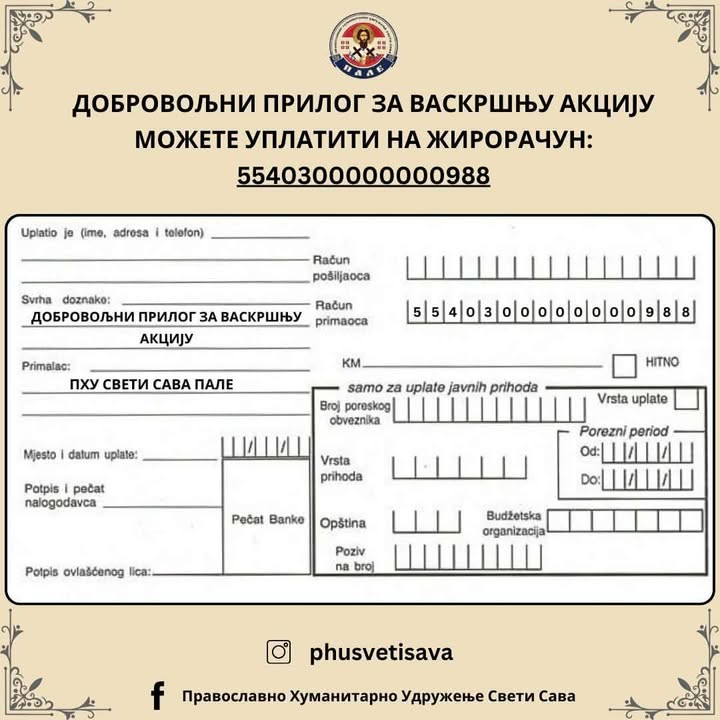 Donacije se mogu izvrđiti i uplatom na žiro-račun udruženja 5540300000000988, uz naznaku „Dobrovoljni prilog za vaskršnju akciju“.