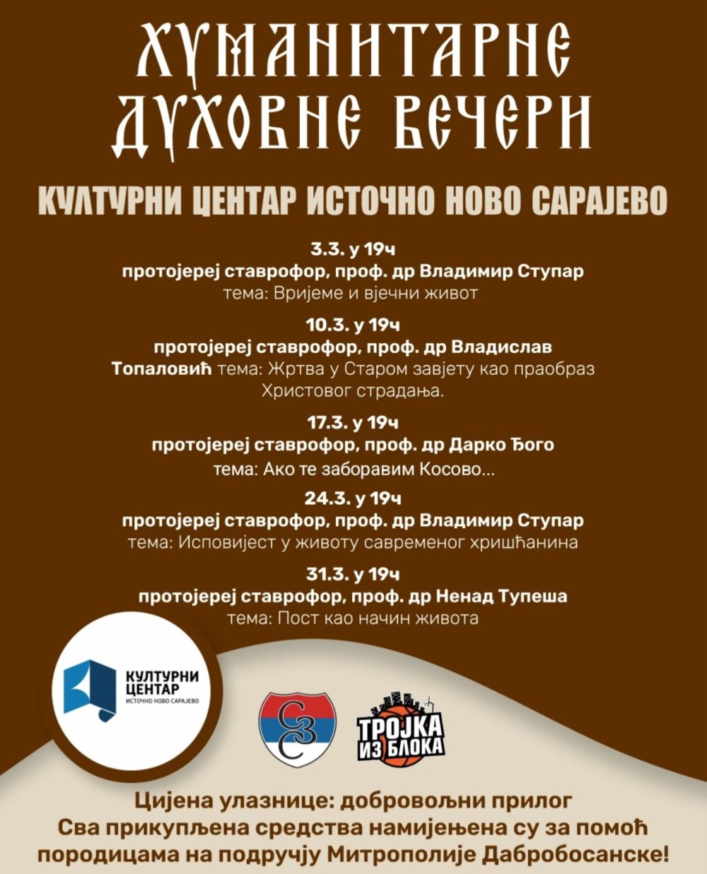 Ово предавање се одржава у склопу циклуса "Хуманитарне духовне вечери", а цијена улазнице је добровољни прилог.