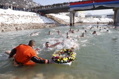 Прије пливања служена је литургија у Храму Светог Великомученика Георгија, након чега је и услиједило освештање воде.